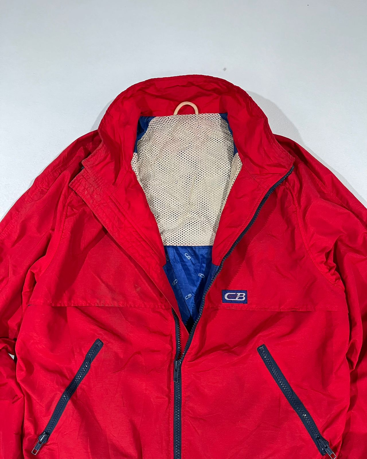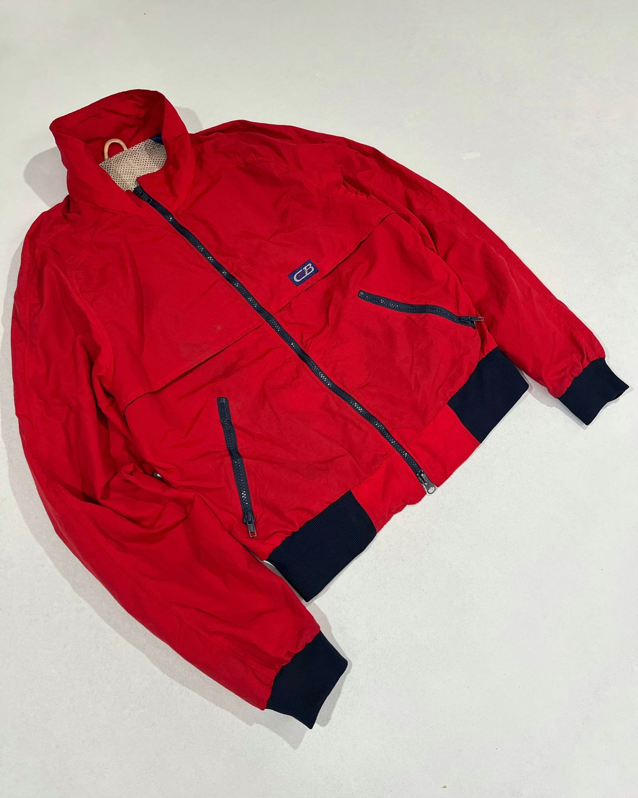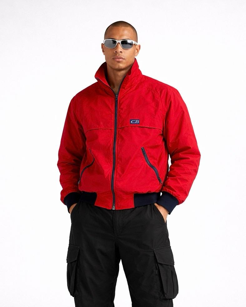 A bold vintage CB red windbreaker jacket with a clean body-fit silhouette. Features contrast navy ribbed cuffs and hem, zippered pockets, and breathable mesh lining. A classic 90s streetwear piece that pairs perfectly with cargo pants and sneakers for a modern retro look.