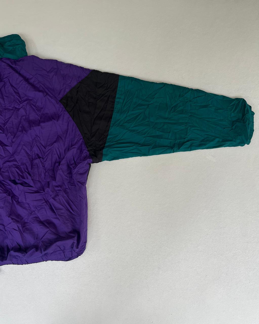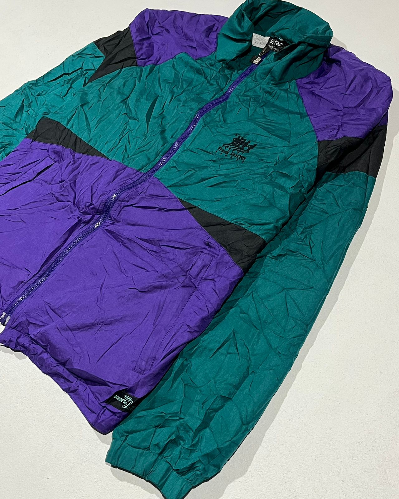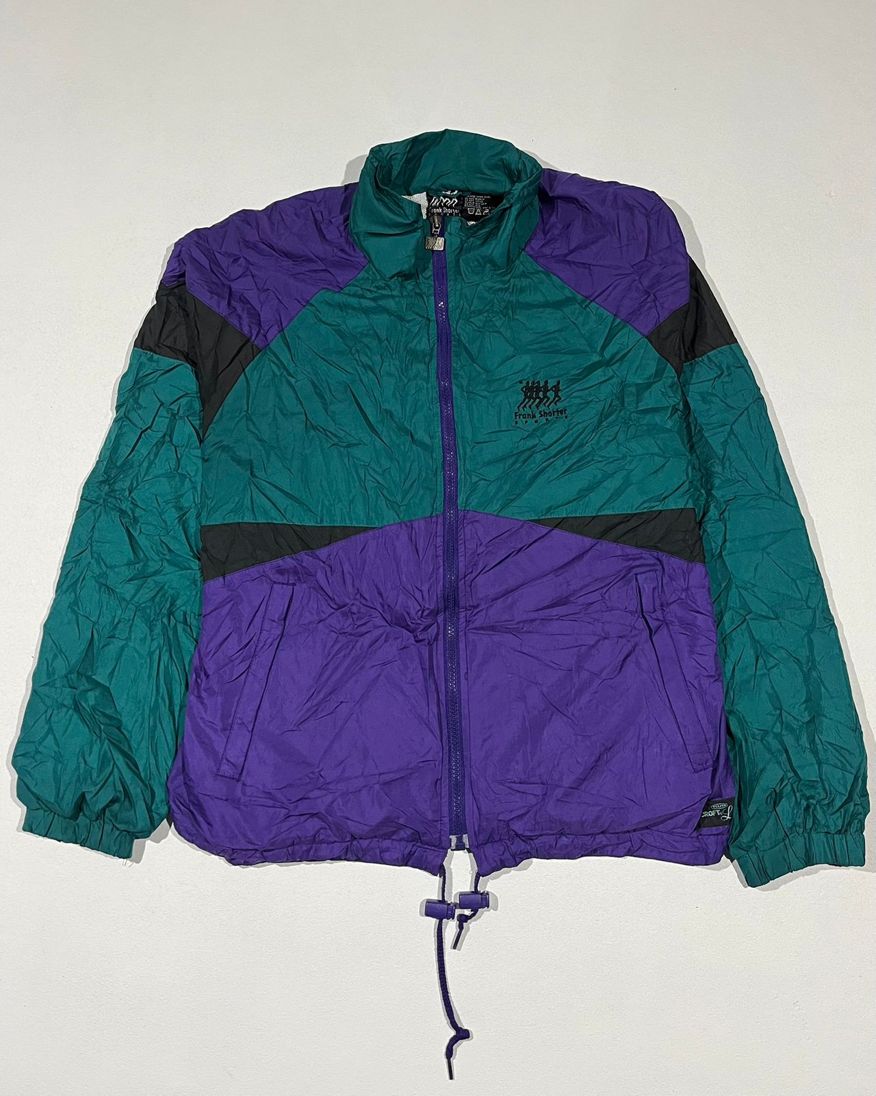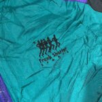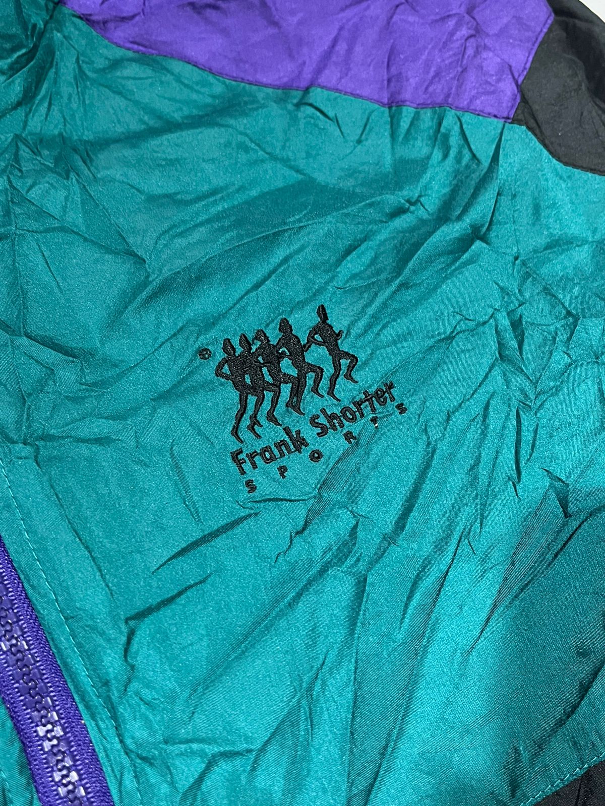 Original Frank Shorter Sports vintage windbreaker jacket featuring a bold 90s color-block design in teal, purple, and black. Lightweight nylon fabric with breathable mesh lining makes it perfect for casual wear, streetwear styling, or vintage collectors. Full zip closure with adjustable drawstring hem.