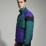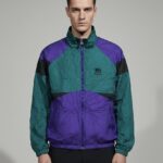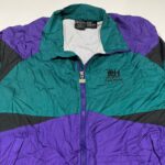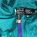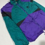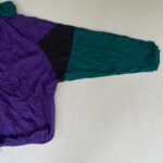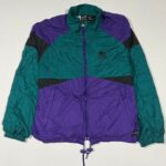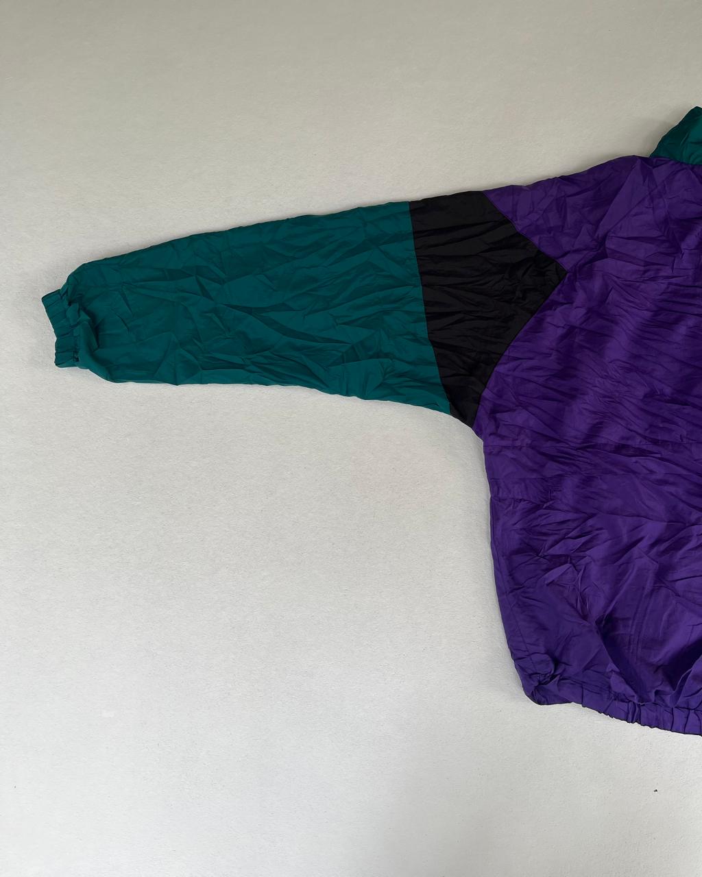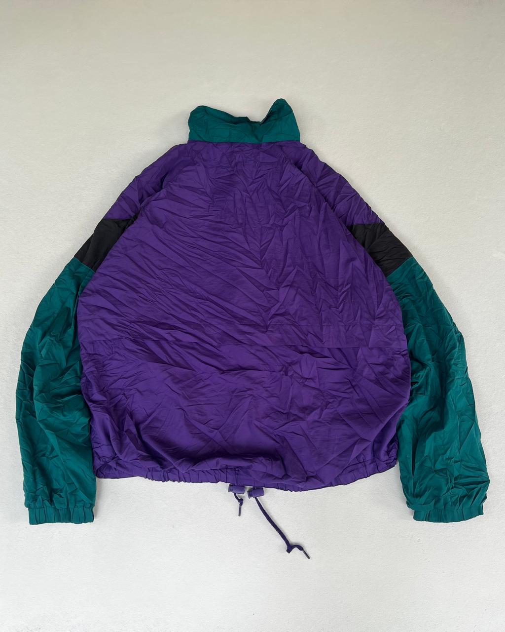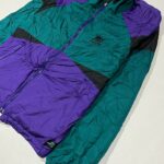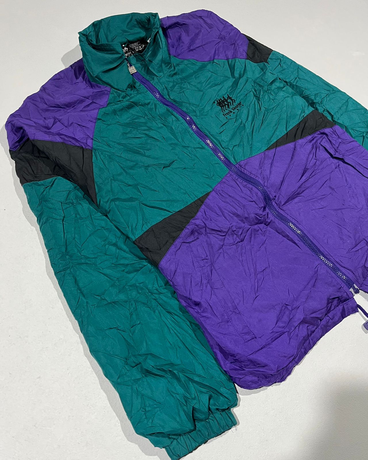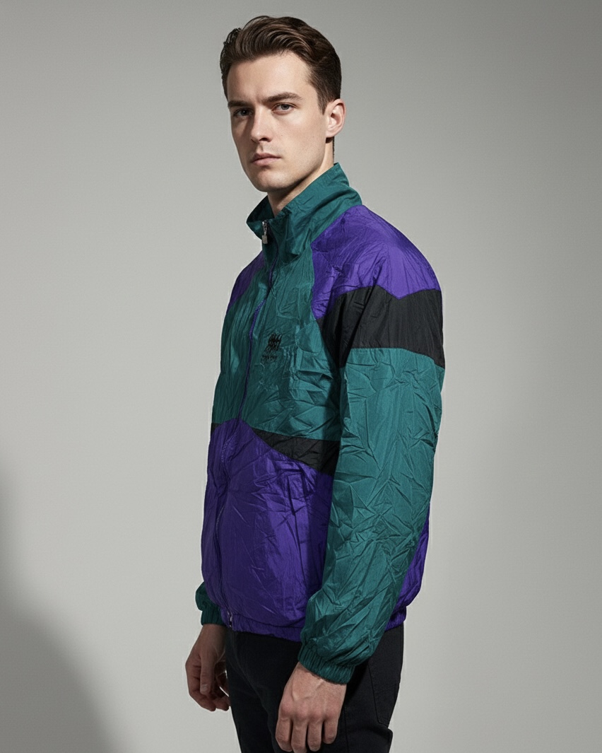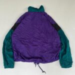 Original Frank Shorter Sports vintage windbreaker jacket featuring a bold 90s color-block design in teal, purple, and black. Lightweight nylon fabric with breathable mesh lining makes it perfect for casual wear, streetwear styling, or vintage collectors. Full zip closure with adjustable drawstring hem.