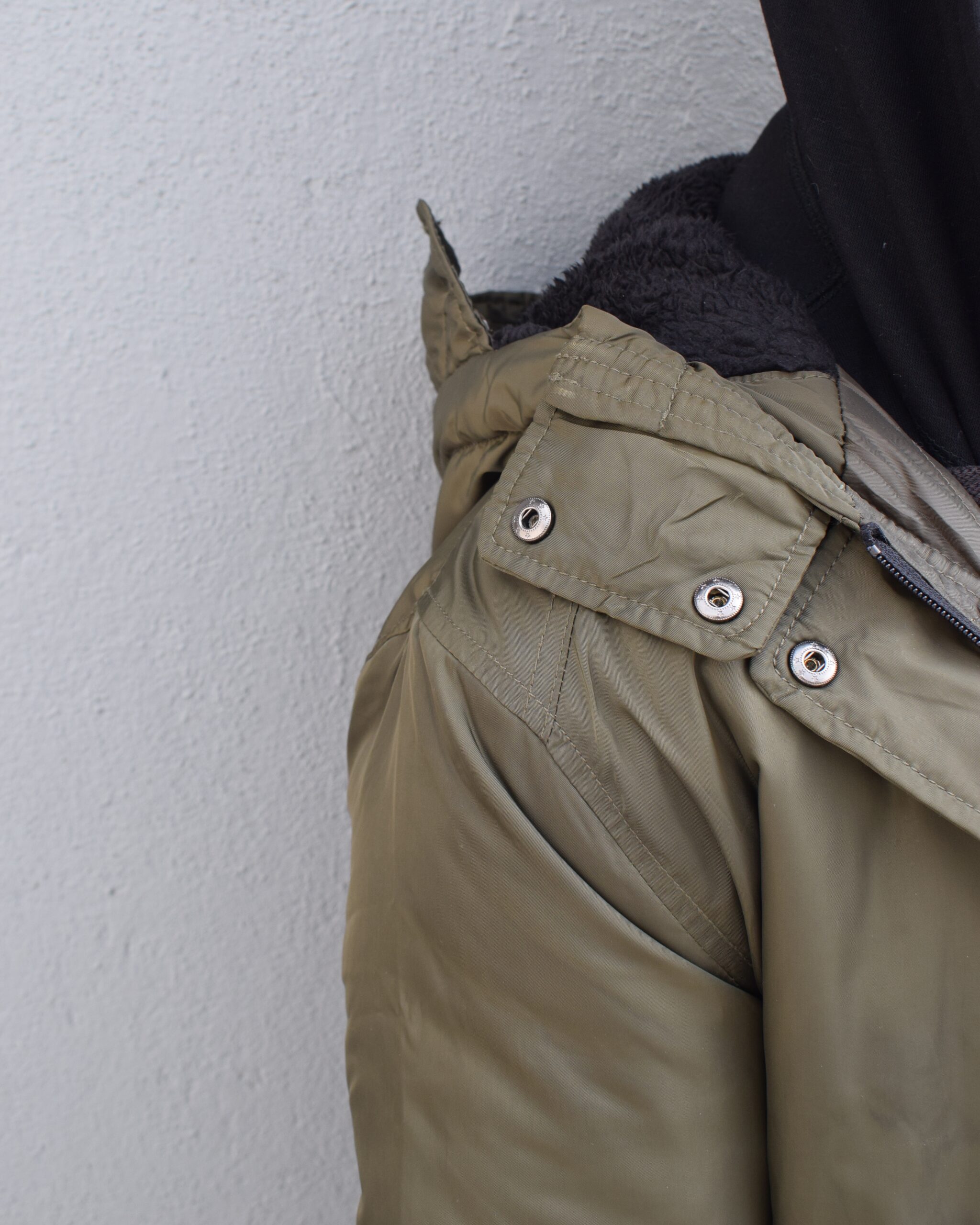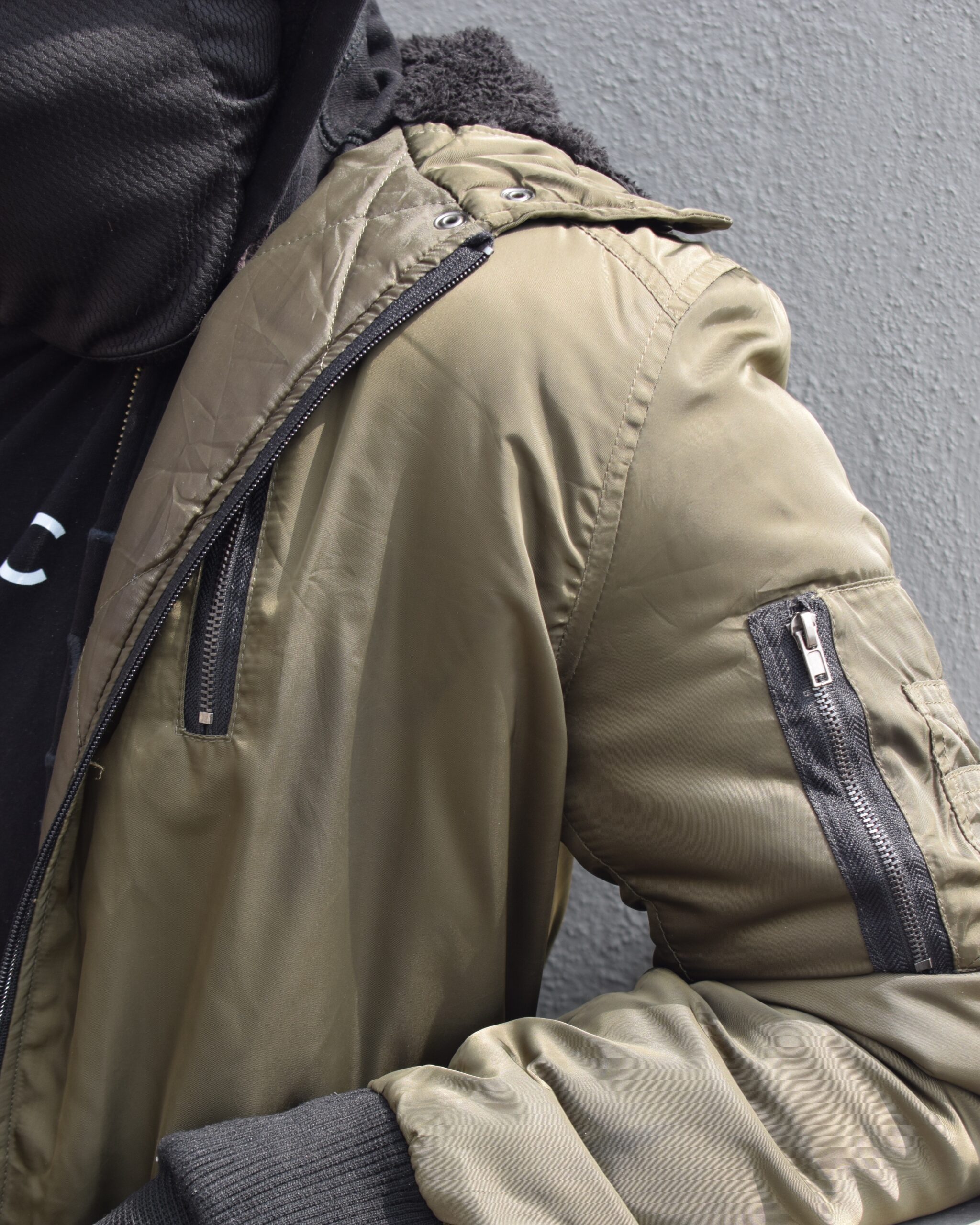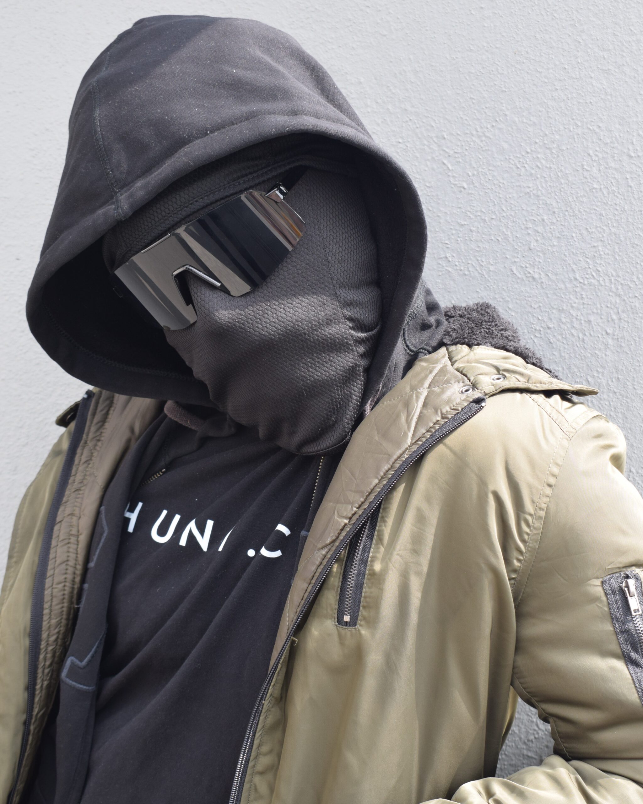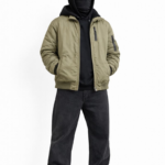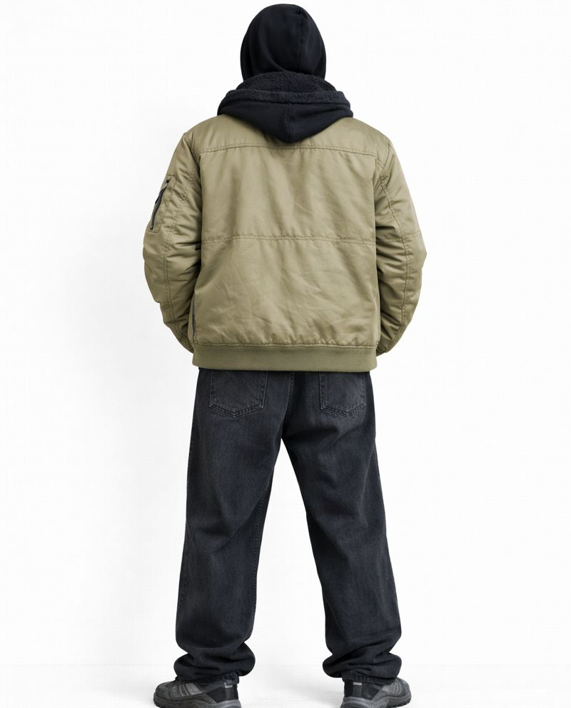 A stealth-inspired olive jacket designed for cold days and city nights.